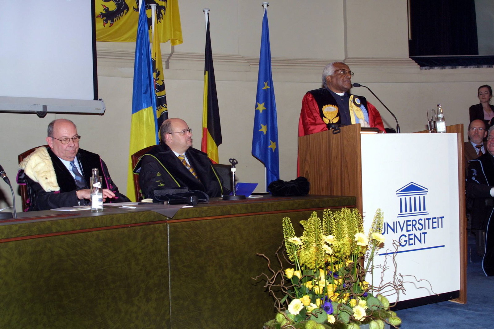 Vlnr. prof. Andreas De Leenheer (rector UGent), prof. Marc De Clercq (vicerector UGent) en aartsbisschop em. Desmond Tutu (eredoctor UGent) -