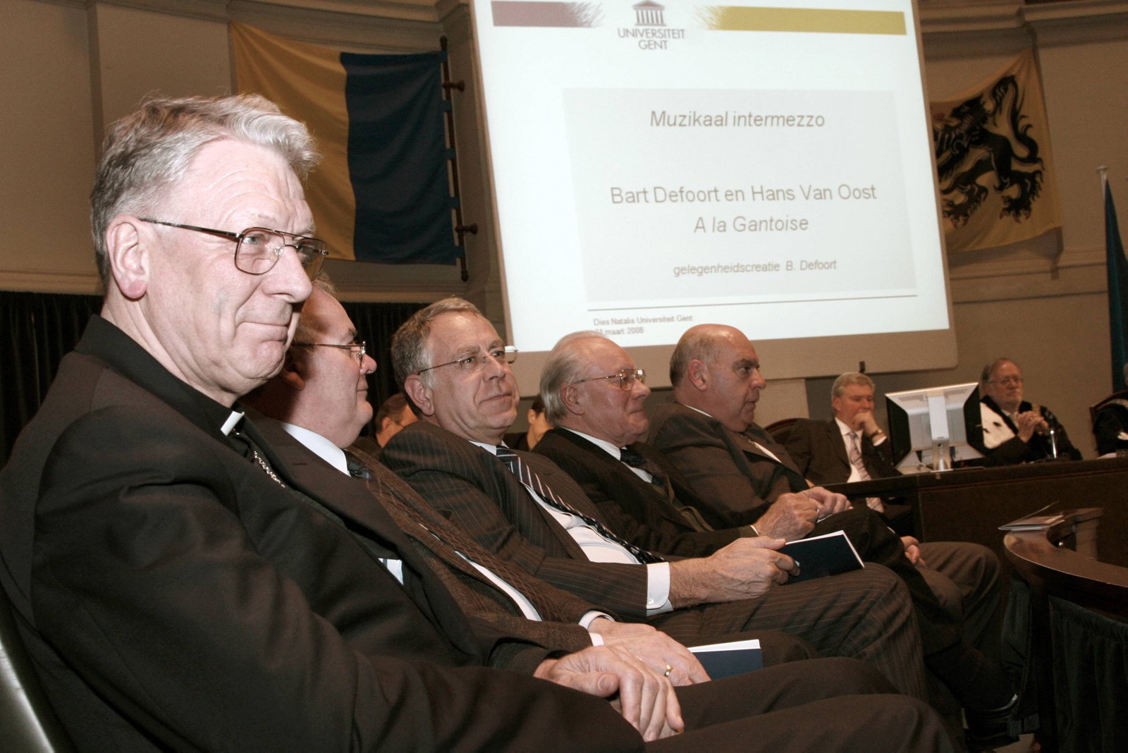 Vlnr. mgr. Luc Van Looy (bisschop bisdom Gent), F. Schins (procureur-generaal Hof van Beroep Gent), Gregor Vande Vyver (eerste voorzitter Arbeidshof), Gilbert Temmerman (minister van staat en ereburgemeester Gent) en Daniël Termont (burgemeester Gent) - © UGent, foto Hilde Christiaens