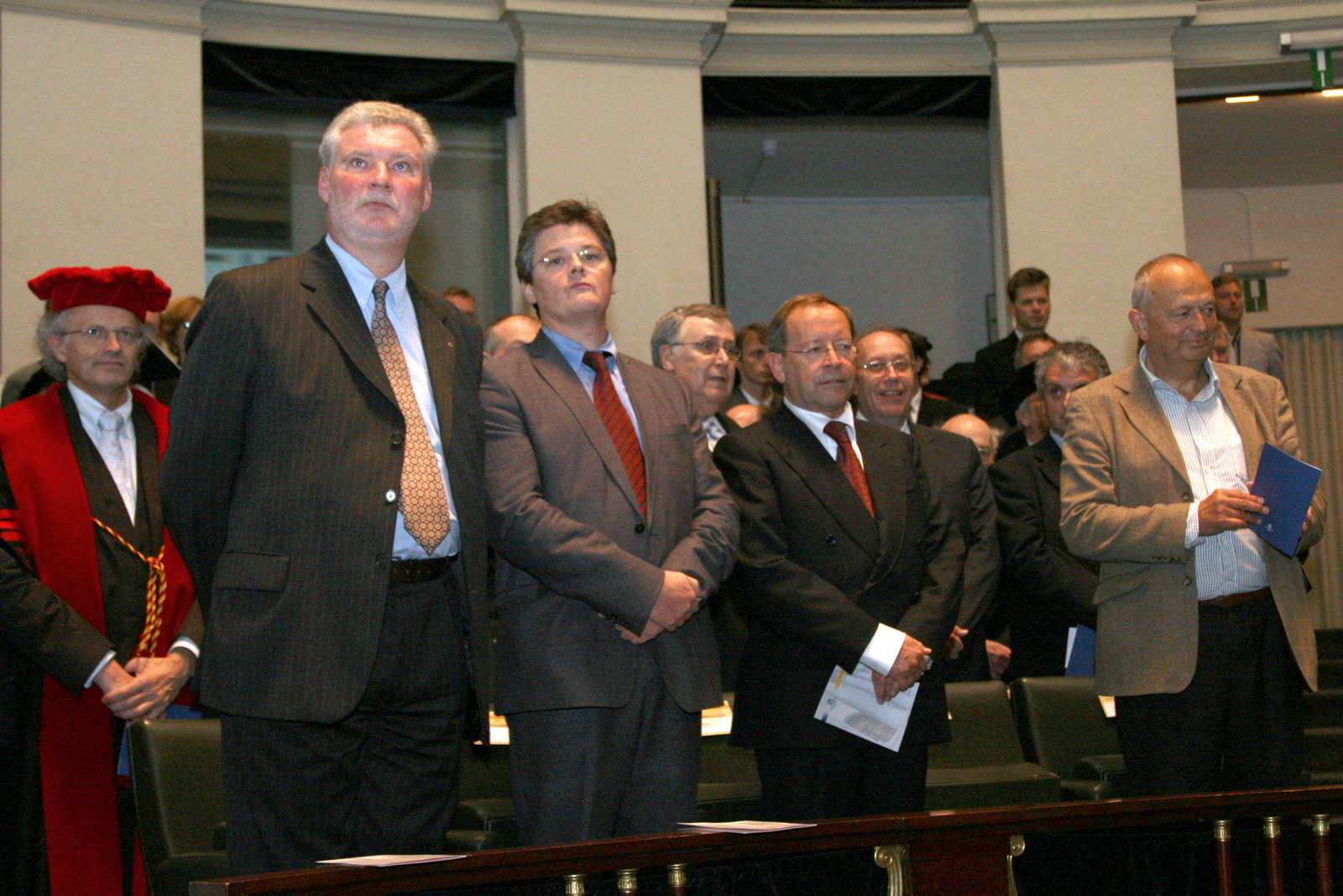 Opening academiejaar 2008: vlnr. op de 1ste rij regeringscommissaris Yannick De Clercq, academisch beheerder Koen Goethals, logistiek beheerder Diederik Mangeleer en afgevaardigd bestuurder UZ Gent Francis Colardyn - © UGent, foto Hilde Christiaens
