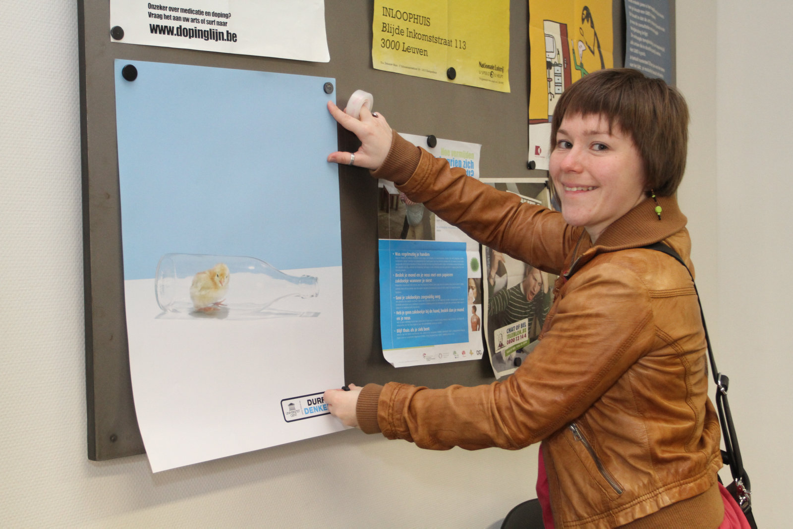 Jobstudenten verspreiden affiches van de Durf Denken campagne in het rectoraat - © UGent, foto Hilde Christiaens
