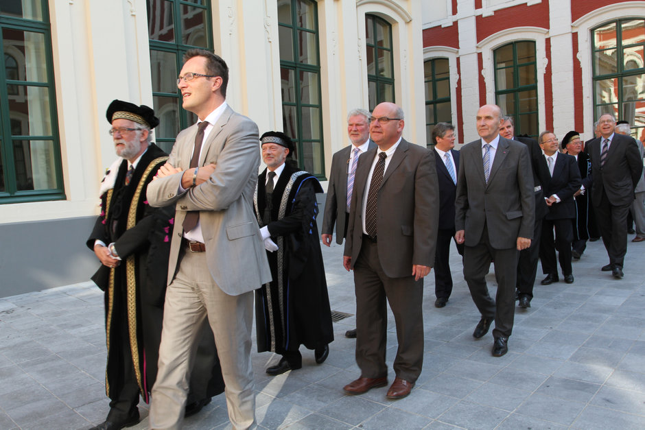 Stoet der togati en genodigden: vlnr. prof. Paul Van Cauwenberge (rector UGent), Pascal Smet (Vlaams minister van Onderwijs, Jeugd, Gelijke Kansen en Brussel), prof. Luc Moens (vicerector UGent), Yannick De Clercq (regeringscommissaris), Daniël Termont (burgemeester Stad Gent), prof. Koen Goethals (academisch beheerder UGent) en André Denys (gouverneur Oost-Vlaanderen) -