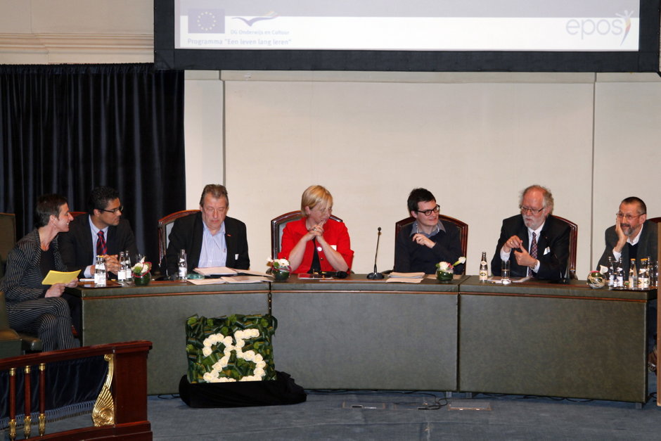 Academische zitting 'Erasmus, changing lives, opening minds, for 25 years': panelgesprek met vlnr. Ann De Bie (moderator), Julio Hansoul (voorzitter Erasmus Student Network Belgium), Serge Schroef (Kathoieke Hogeschool Zuid-West-Vlaanderen), Hilde Haems (USG People), Michiel Horsten (Vlaamse Vereniging van Studenten), Paul Van Cauwenberge (rector UGent) en Noël Vercruysse (afdelingshoofd Hoger Onderwijs en Volwassenenonderwijs) -