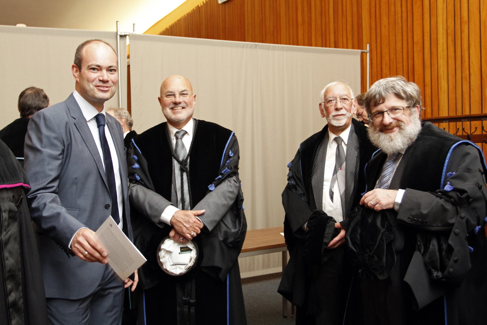 Vlnr. Jeroen Vanden Berghe (logistiek beheerder UGent), prof. Guido Vanden Berghe, em. prof. Georges Stoops en prof. Philippe De Maeyer - © UGent, foto Hilde Christiaens