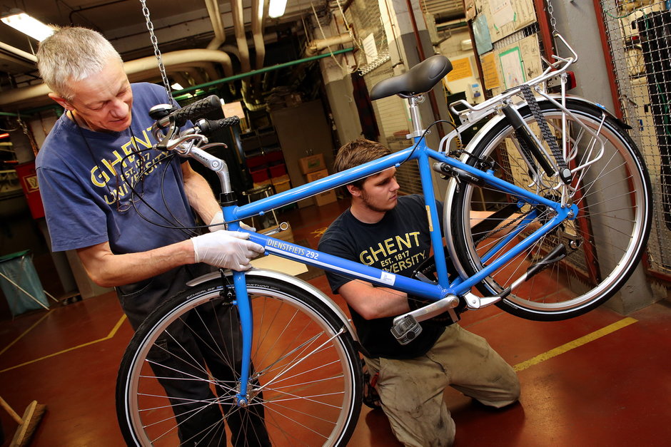 Bestickering nieuwe dienstfietsen in fietsherstelplaats Blandijnberg