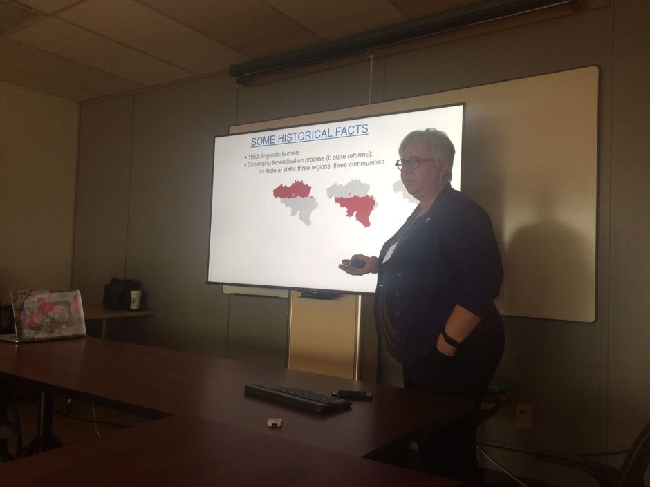 Vicerector Mieke Van Herreweghe geeft uitleg over taalonderwijs in België - © UGent