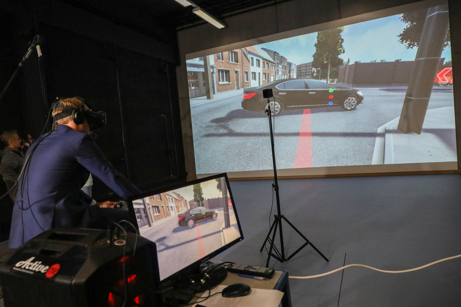 Vlaams minister Ben Weyts test de virtual reality bril voor gevaarherkenning op de fiets - © UGent, foto Hilde Christiaens